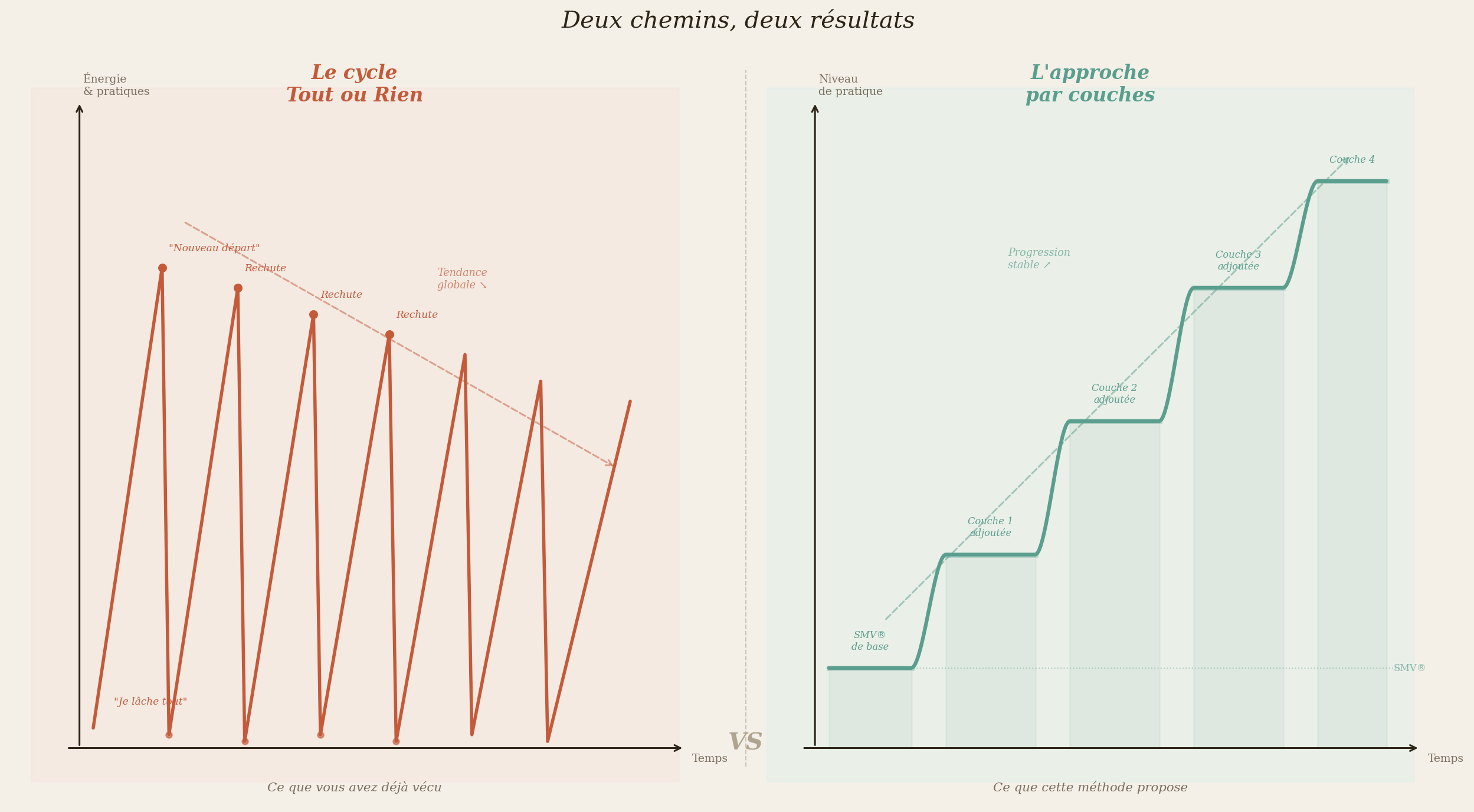 On ne cherche pas à finir un triathlon sur un coup de tête pour redevenir le même homme le lendemain. On cherche d'abord à cimenter une base solide, votre SMV®, puis à rajouter, une par une, des pratiques plus exigeantes pour préserver notre santé mentale et physique.
