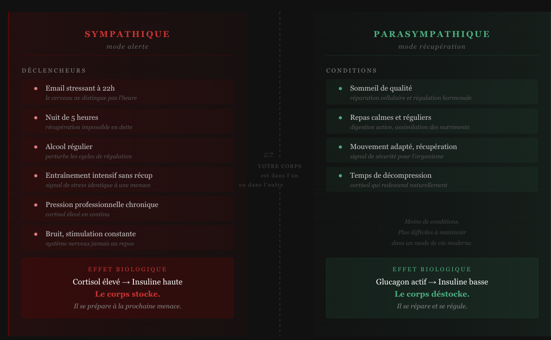 Un homme qui dort peu, travaille sous pression, s'entraîne intensément sans récupération adaptée et consomme régulièrement de l'alcool ne vit pas dans un corps en mode parasympathique. Il vit dans un corps en alerte chronique. Et un corps en alerte chronique stocke. C'est un mécanisme de survie : en situation d'incertitude prolongée, l'organisme constitue des réserves. Il ne sait pas quand la prochaine menace arrivera. Alors il garde.